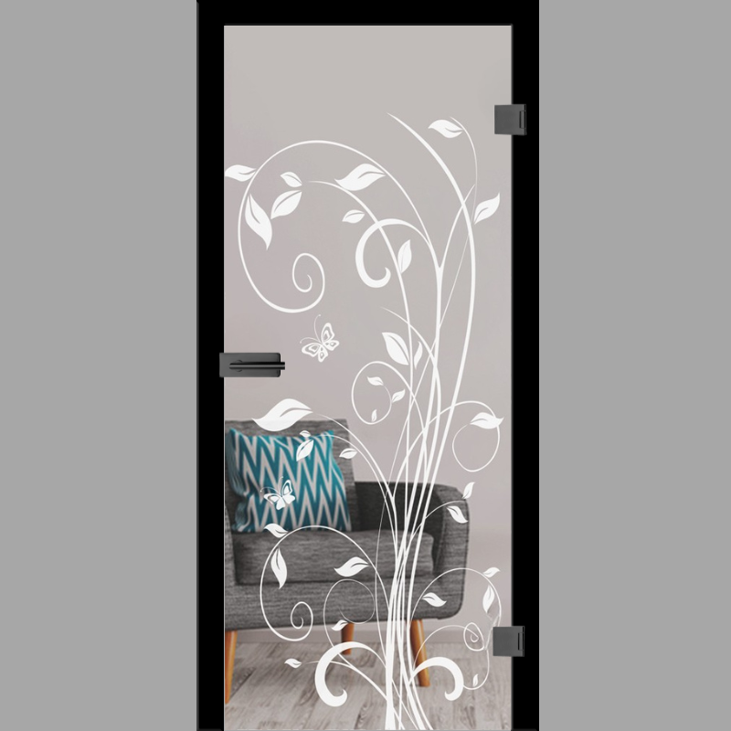 Die satinierte Glastür „Flowers 1“ bringt elegante Natürlichkeit in dein Zuhause. Feine Ranken mit Schmetterlingen verlaufen in klarem Motivdruck über die Tür und erzeugen eine charmante Leichtigkeit. Die matte Oberfläche sorgt für angenehmen Sichtschutz, ohne den Raum zu verdunkeln. Mit der passenden Zarge wird die Tür zum edlen Komplettset für Wohnbereiche, Schlafräume oder Homeoffices.