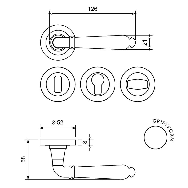 - Rosette: Ø 52 mm, Höhe 8 mm