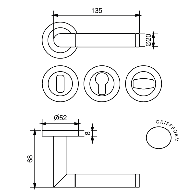 - Rosette: Ø 52 mm, Höhe 8 mm
