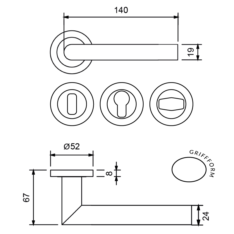 - Rosette: Ø 52 mm, Höhe 8 mm